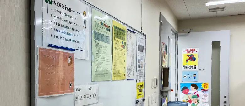 「全ての始まりは安全から」との考えから、大王グループでは工場内における社員同士の挨拶は「ご安全に」です。また、左胸に右手の拳をあてる「ご安全に」の合図を社員で考え取り入れています。これは「安全を自分の魂に刻む」という意味があり、声が通りにくい現場での挨拶としています。