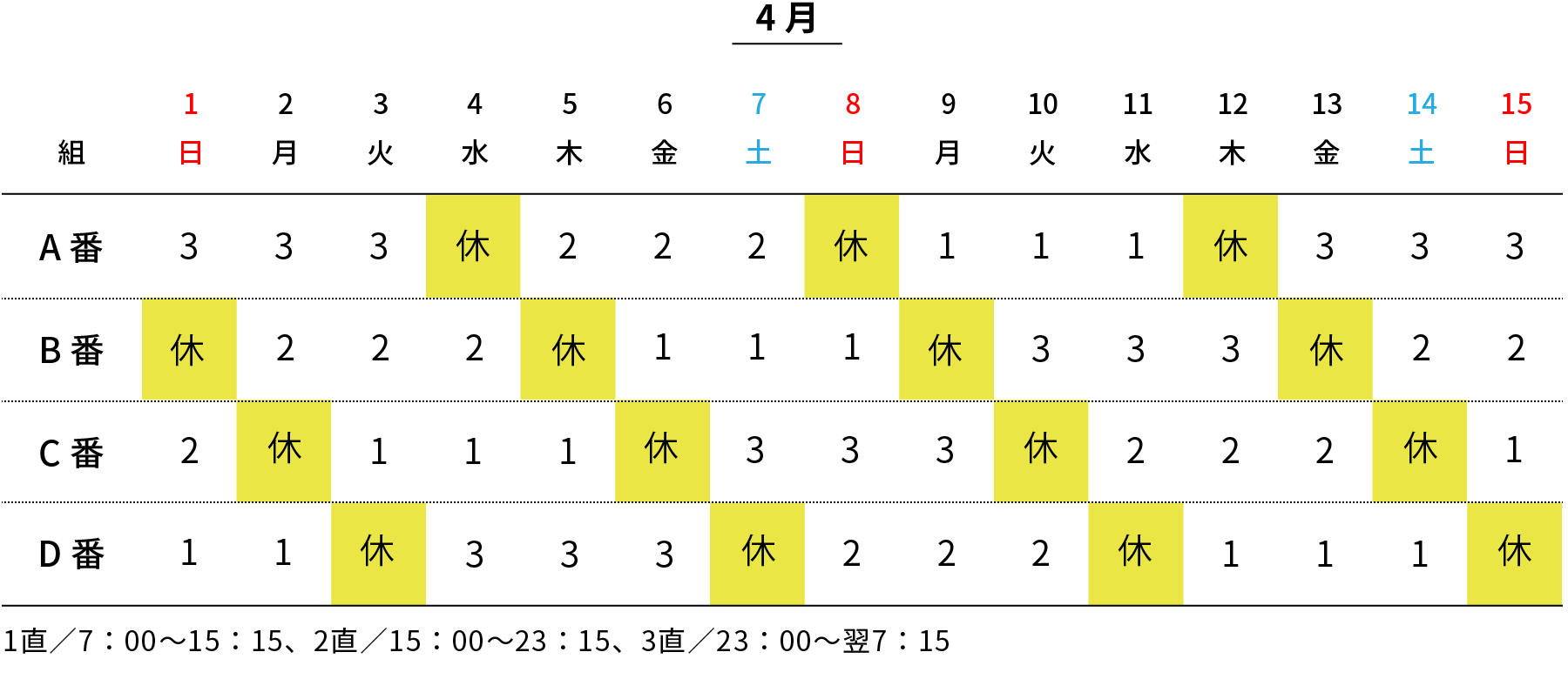 4組3交替制は、4つの組(A~D)に分かれ、 1直〜3直の直番勤務か休日のいずれかに就きます。下記のような直番表(スケジュール表)に基づき「出勤日」「出勤時間」「休日」が決まります。