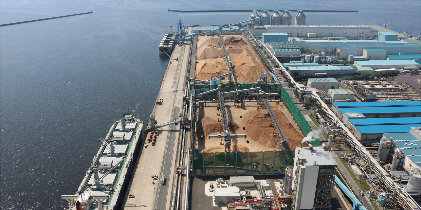 臨海部には10万トンクラスの船が4隻同時着岸できる湾岸設備を有し、国内外から運ばれてくる原燃料(チップや石炭)を船から直接工場へ搬入しています。