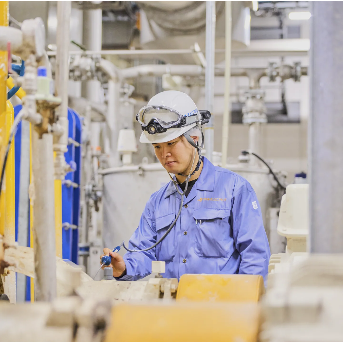 私は三島工場で家庭紙マシンの保全スタッフとして、ティシューやトイレットペーパーを生産する抄紙機のメンテナンスを担当しています。具体的には、設備異常に対応するための工事の手配・施工管理や、日常的な設備点検を行っています。さらに、点検や修理にとどまらず、安全性・生産性・収益性の向上を目的とした設備改善工事の計画・手配・施工管理にも取り組んでいます。